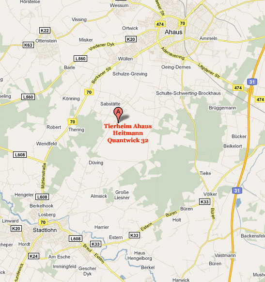 Gronau kommen, Dann fahren Sie am Krankenhaus (Kreisverkehr) vorbei bis zur nächsten Ampel, hier biegen Sie links ab (Düwing Dyk.). Das Tierheim finden Sie nach ca. 4 km auf der linken Seite (Hinweisschild) Wenn Sie auf der B 70 aus Richtung Borken / Stadtlohn kommen, fahren Sie weiter auf der B 70 durch die Ortschaft Wüllen bis Sie am Ortsende an eine Ampel kommen. Hier biegen Sie nach rechts auf den Düwing Dyk ab. Nach ca. 4 km finden Sie das Tierheim auf der linken Seite.